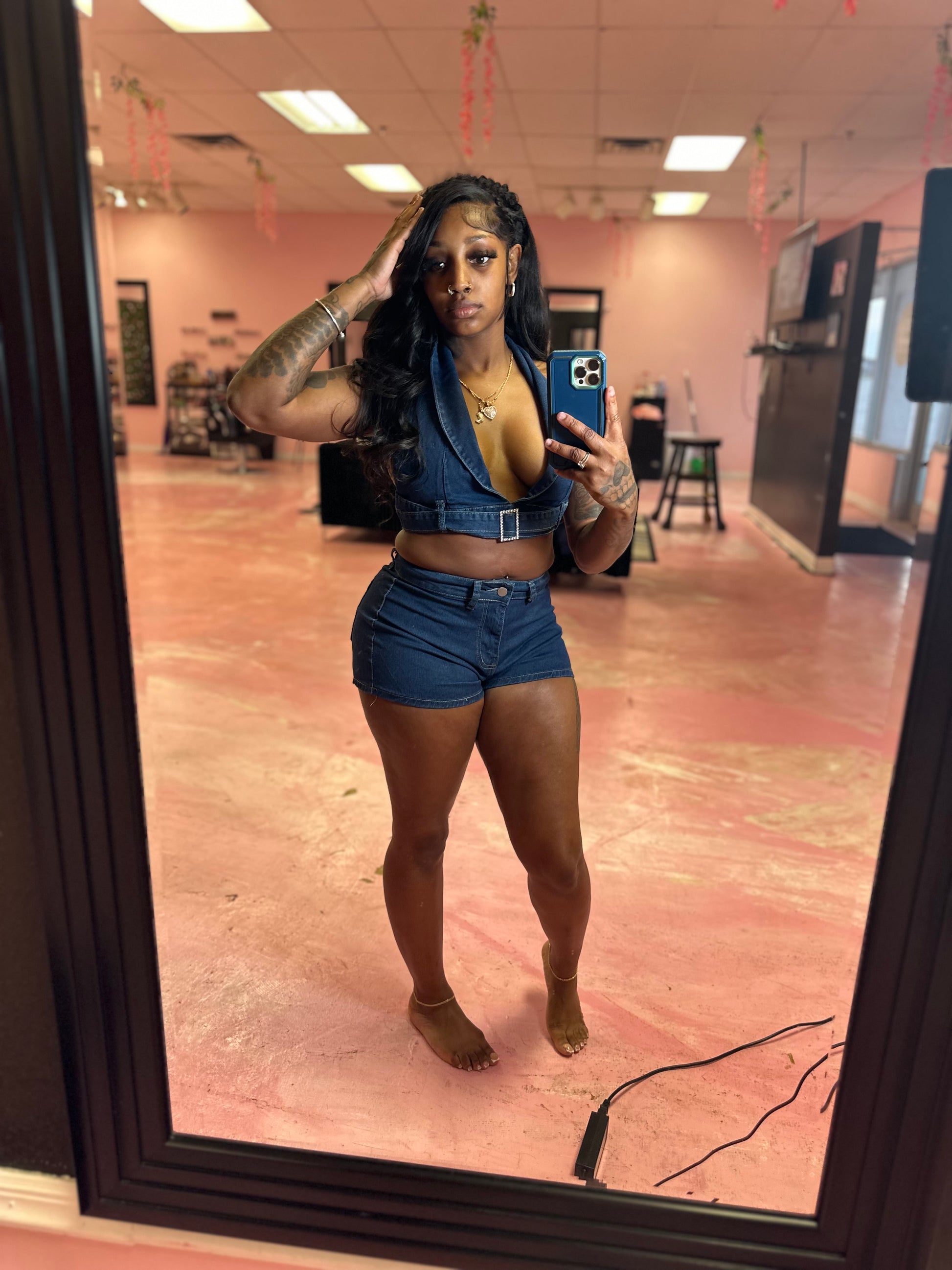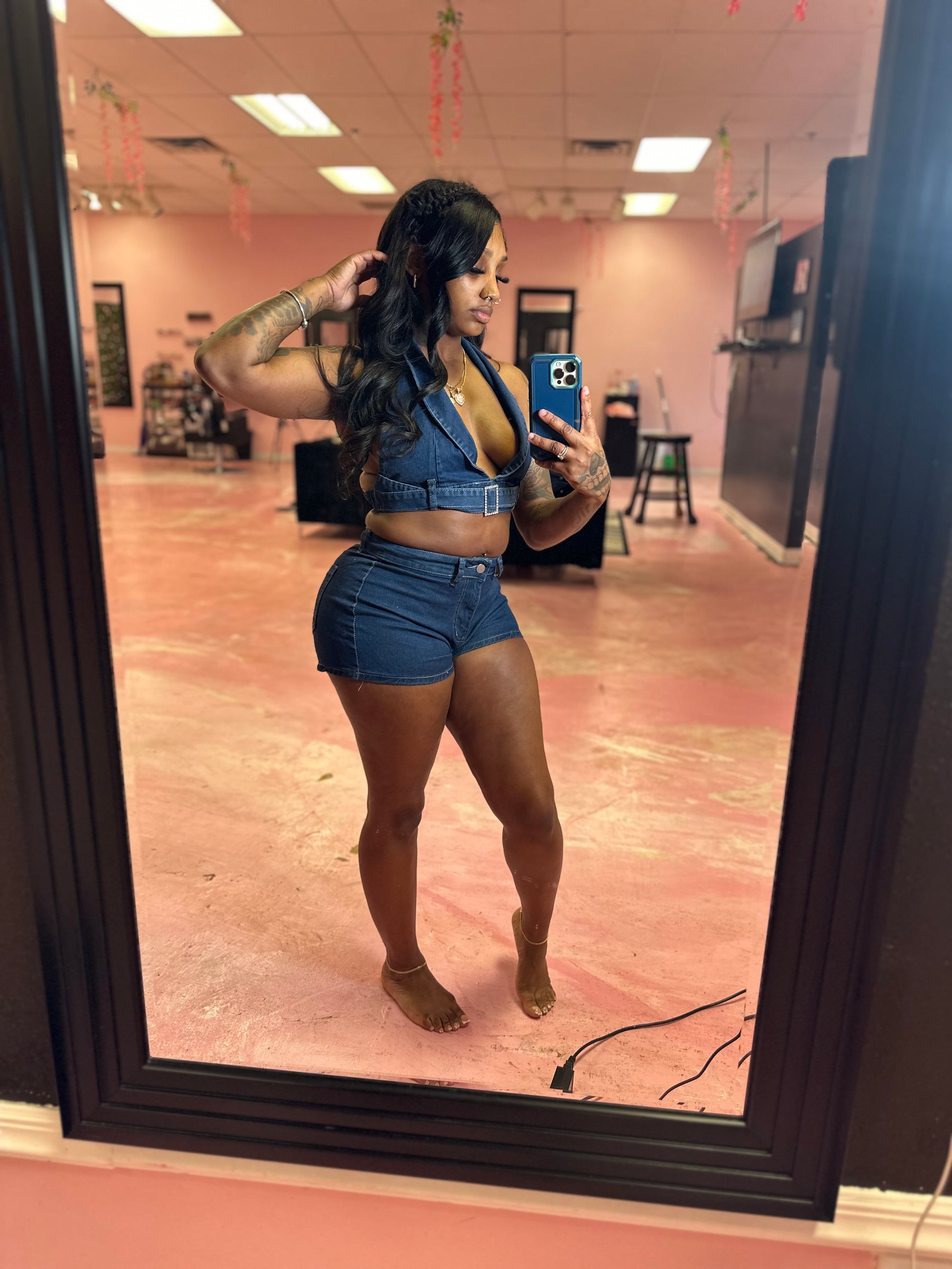 Denim bralette and mini shorts